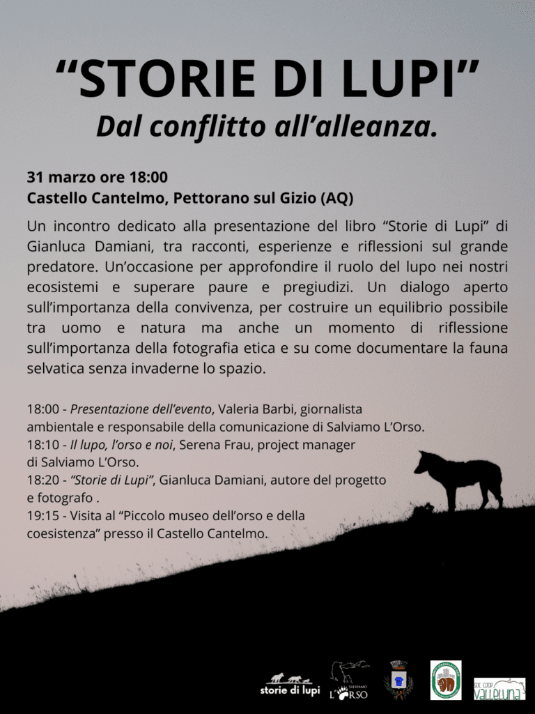 Il 31 marzo 2026, a partire dalle 18:00, il Castello Cantelmo di Pettorano sul Gizio apre le porte al lupo in un incontro dedicato alla presentazione del libro “Storie di Lupi” del fotografo Gianluca Damiani.